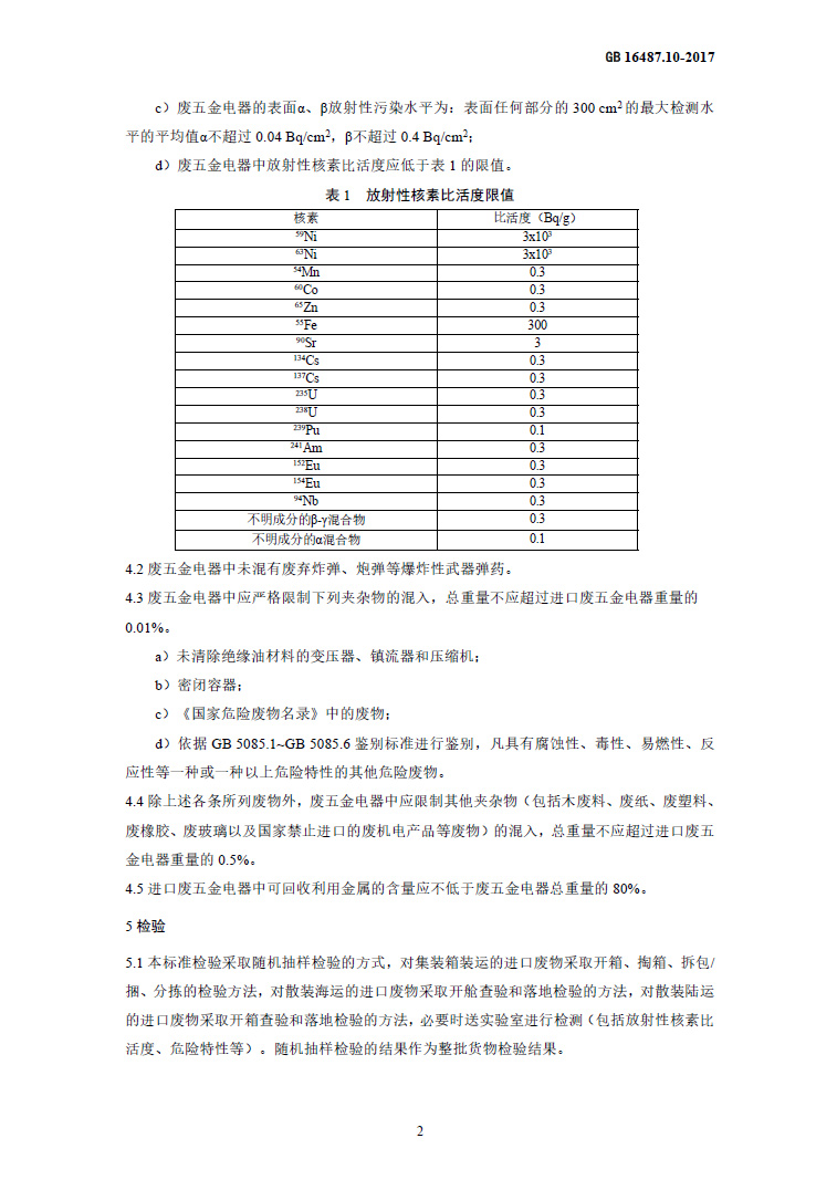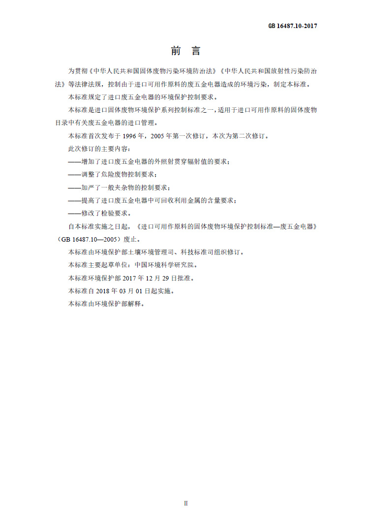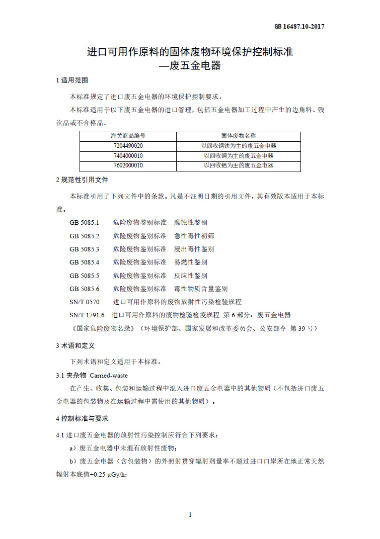 為貫徹《中華人民共和國固體廢物污染環境防治法》《中華人民共和國放射性污染防治法》等法律法規,控制由于進口可用作原料的廢五金電器造成的環境污染,制定本標準。本標準規定了進口廢五金電器的環境保護控制要求。本標準是進口固體廢物環境保護系列控制標準之一,適用于進口可用作原料的固體廢物目錄中有關廢五金電器的進口管理。