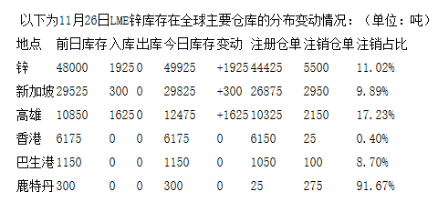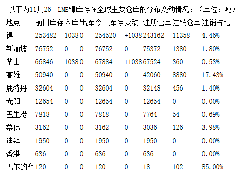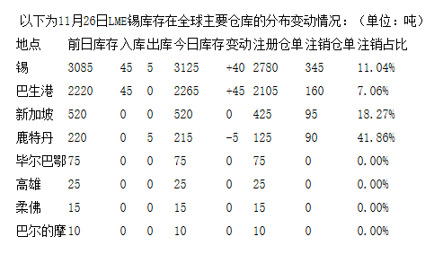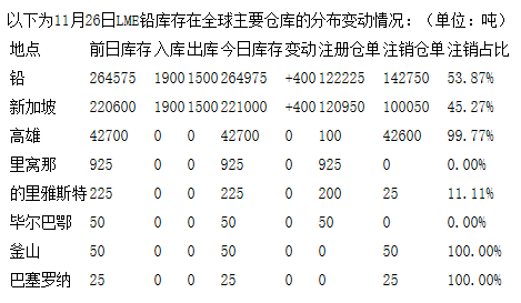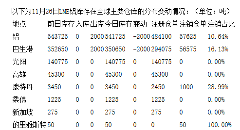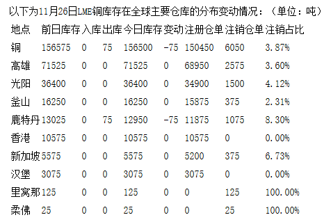 LME11月26日有色金屬庫存分布情況