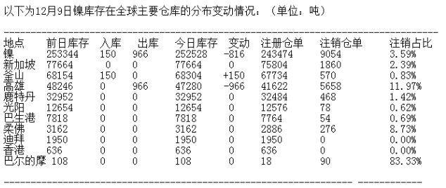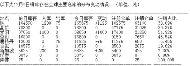 12月9日訊,倫敦金屬交易所(LME)有色金屬庫存及變化如下: