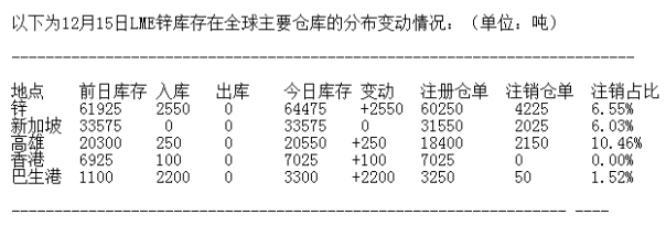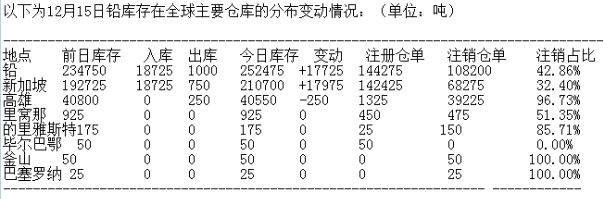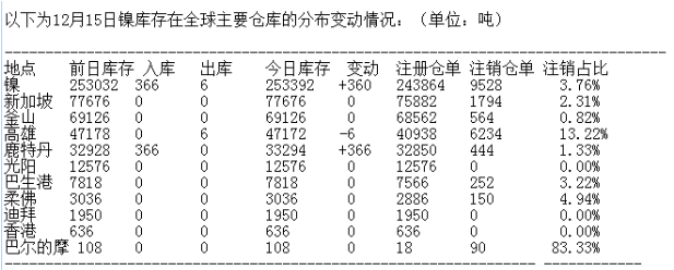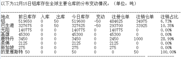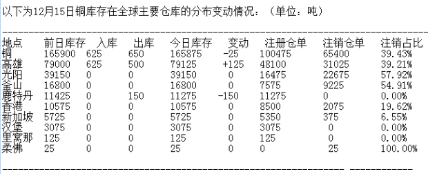 LME 12月15日有色金屬庫存分布情況