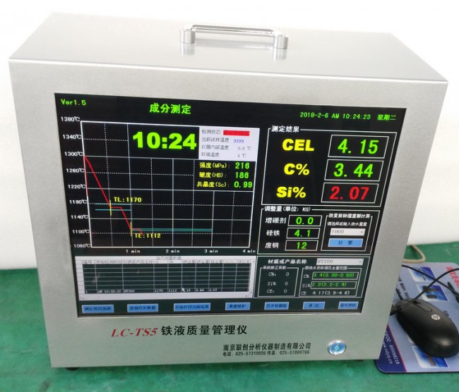 用于爐前快速測定灰鑄鐵和球墨鑄鐵鐵水的碳當量CE\%、碳含量C\%、硅含量Si\%、球化率SG\%等鐵水性能;預測普通灰鑄鐵的抗拉強度等。非專業人員經簡單培訓即可操作;在鐵水可等待的時間內完成檢測,然后根據自動計算出的增碳劑、硅鐵、廢鋼投放量對鐵水成份進行調整,有效的指導生產實踐。