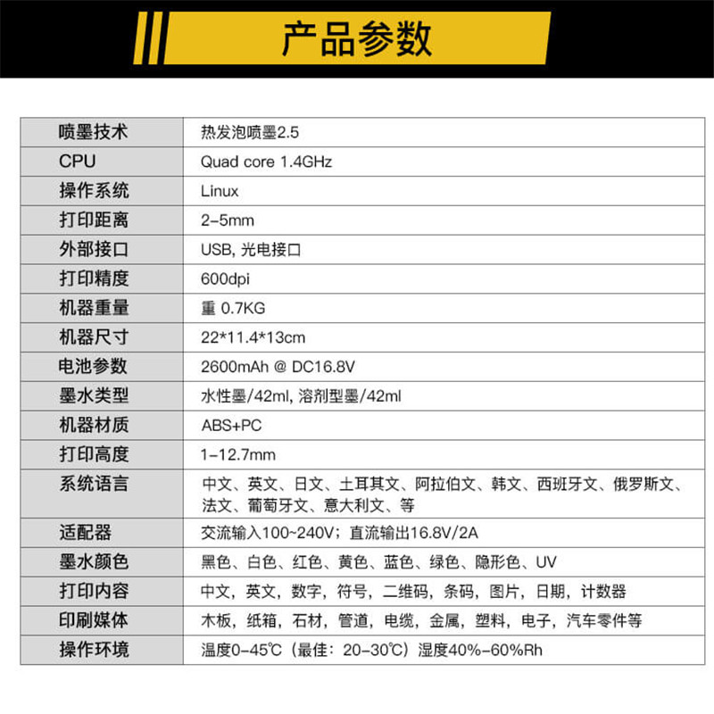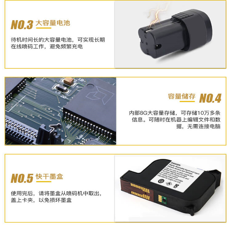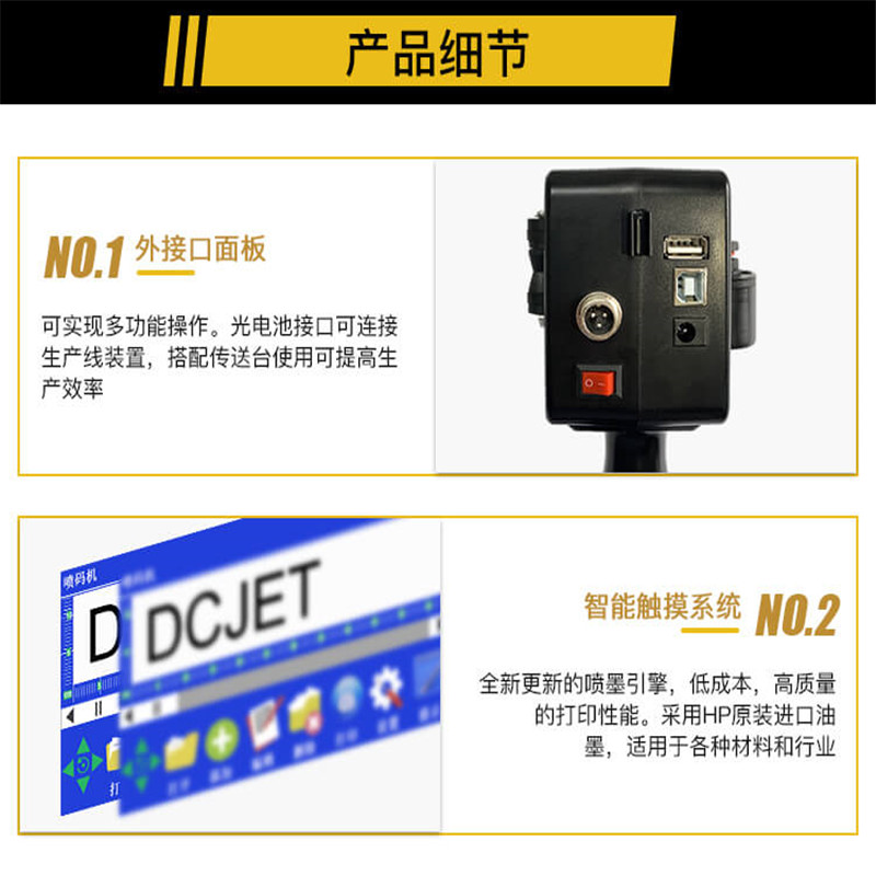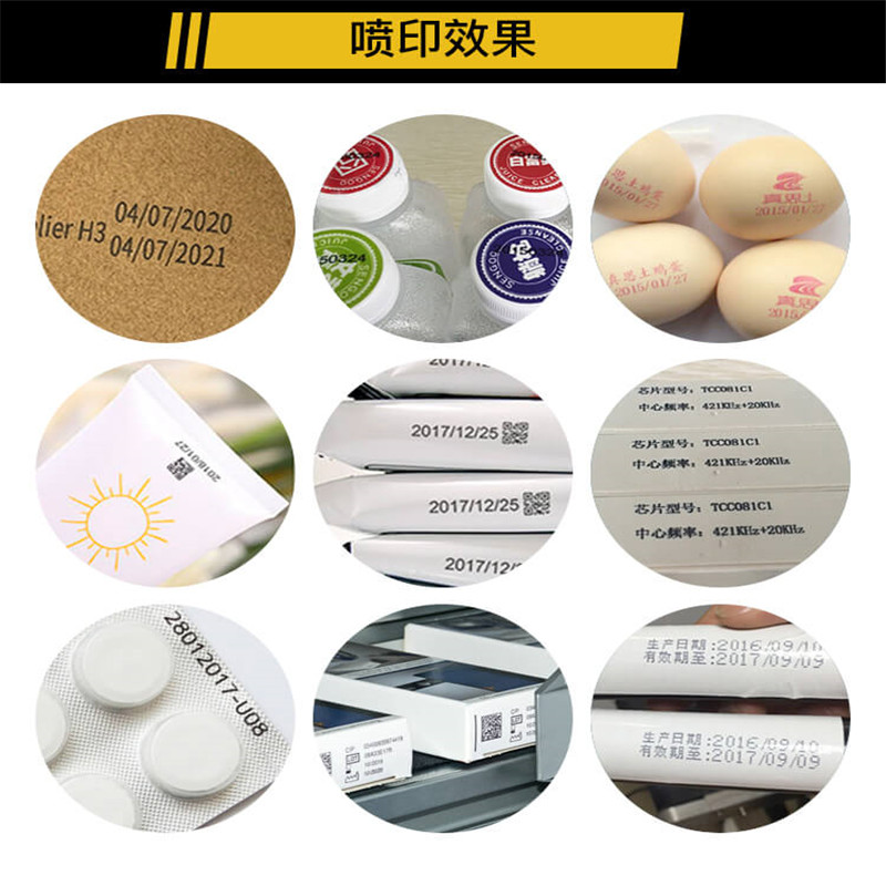 手動生產日期噴碼機使用的耗材是墨盒,類似打印機里面的墨盒一樣,不使用的時候取下來墨盒的容量是47毫升,可以打印10萬以上的日期(根據字體大小,內容不同而有所不同).墨水很耐用,使用的是速干墨水,噴印上產品是秒干的.手動生產日期噴碼機的屏幕是4.7寸的彩色觸摸顯示屏,靈敏度很高,操作很方便