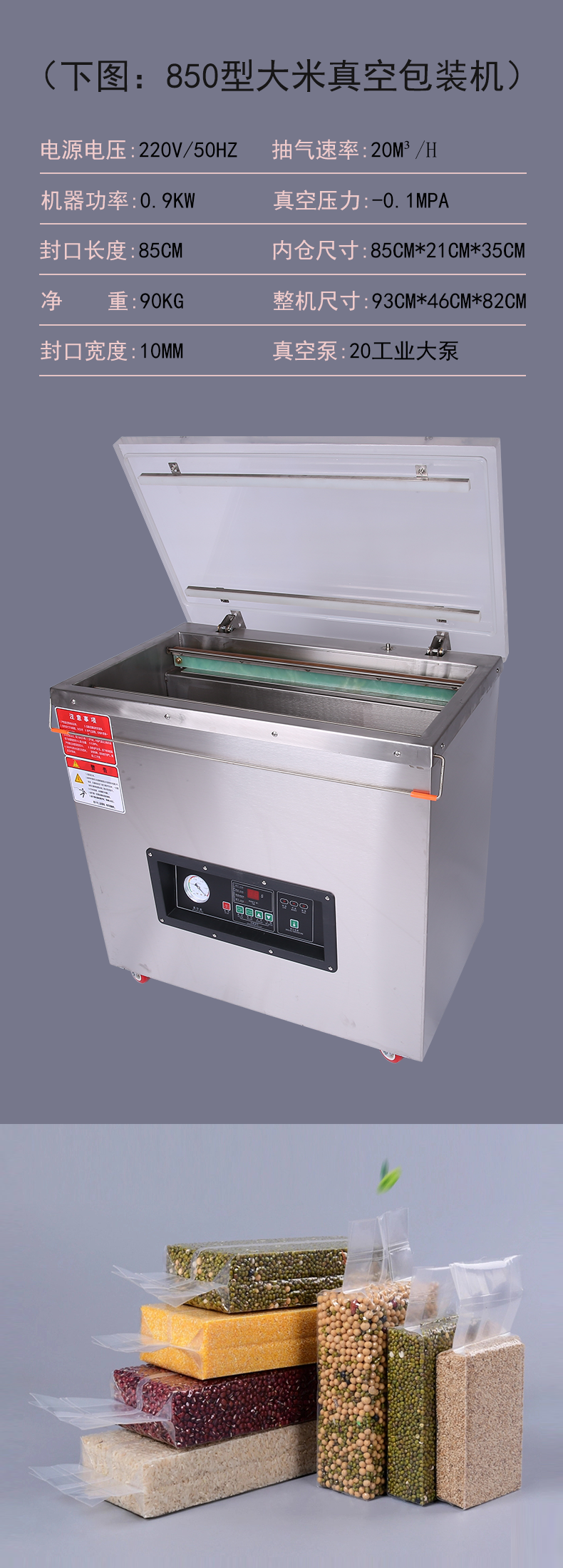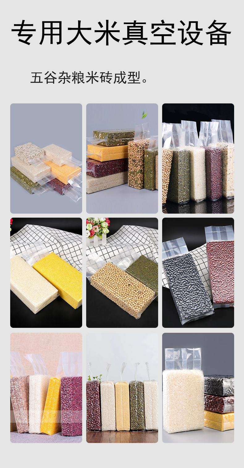 大米米磚真空包裝機(jī) 武漢大米米磚真空包裝機(jī)是加深型直空包裝機(jī),自帶有多種不同大小的米磚模具,直空句裝后可以延長(zhǎng)產(chǎn)品的保質(zhì)期,起到耐氧化、防蟲(chóng)蛀、霉變、防受潮等功能,是一款專為直空包裝大米米磚的機(jī)型產(chǎn)品。該直空包裝機(jī)是中小型大米生產(chǎn)廠家直空包裝的*機(jī)型。