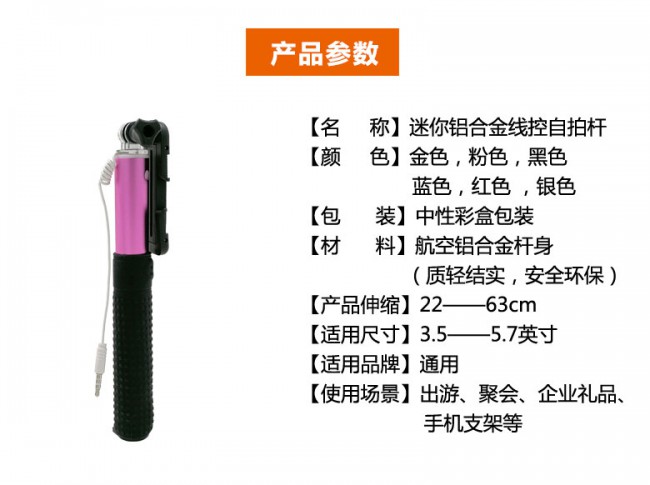產品描述:60cm鋁合金自拍神器采用四節合金管,最大縮短長度僅有20CM,夾子精心設計可折疊,以致褲兜口袋都可攜帶,而且輕巧凈重僅僅有160g,航空鋁材質地輕,硬,安全,給您的手機最大程度的安全保障,拿在您的手中,完美、時尚又有檔次,是您和家人團聚,旅行,生活的最佳必備產品.