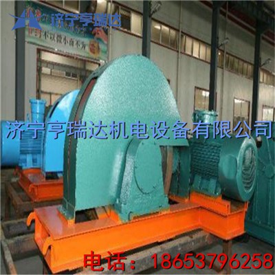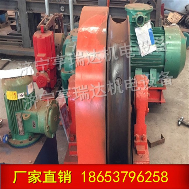 JWB型無極繩絞車系統配置有主機、張緊裝置、梭車、尾輪、壓繩輪、托繩輪和轉向裝置等。主機由電動機、減速箱、傳動齒輪、摩擦輪、制動器、支架及底座等部分組成。電動機選用隔爆型三相異步電動機、功率為22~160KW、根據需要可配置雙速電機。減速箱具有機械變速功能、可實現快慢兩種速度、快慢速比在2倍左右。傳動齒輪采用漸開線圓柱齒輪、開式齒輪傳動,傳動平穩。
